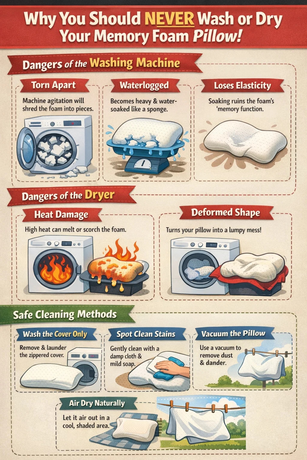 الجواب المباشر هو: بالتأكيد لا تفعل هذا! أثناء رمي الخاص بك وسادة رغوة الذاكرة مباشرة في الغسالة والمجفف قد يبدو الأمر سهلاً وصحيًا، وهذا الإجراء "يقتل" وسادتك عمليًا. لهذا السبب يجب عليك بالتأكيد تجنب هاتين الآلتين، وبعض طرق التنظيف الأكثر موثوقية: