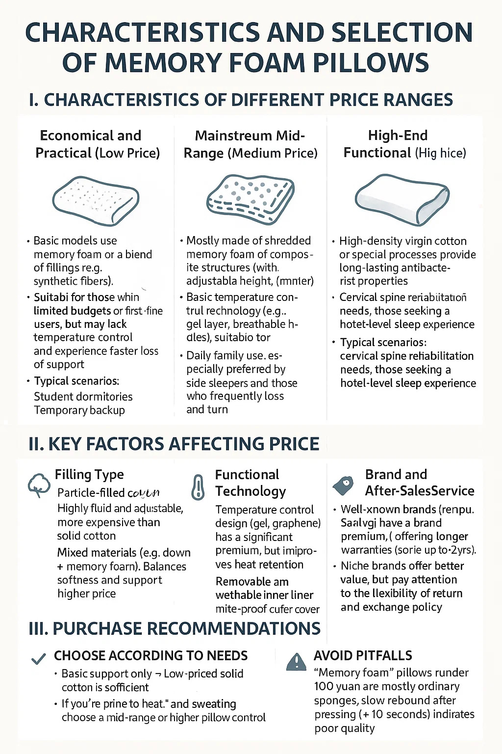 • النماذج الأساسية تستخدم الرغوة ذات الذاكرة أو مزيج من الحشوات (على سبيل المثال، الألياف الاصطناعية والقطن الممزق)، بسعر مناسب.