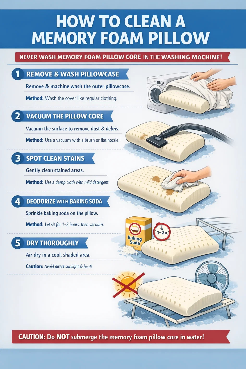 على الرغم من أنه لا يمكن غسل "قلب الوسادة" في الغسالة، إلا أنه يمكنك تنظيف وسادتك الإسفنجية بأمان باستخدام الخطوات التالية: