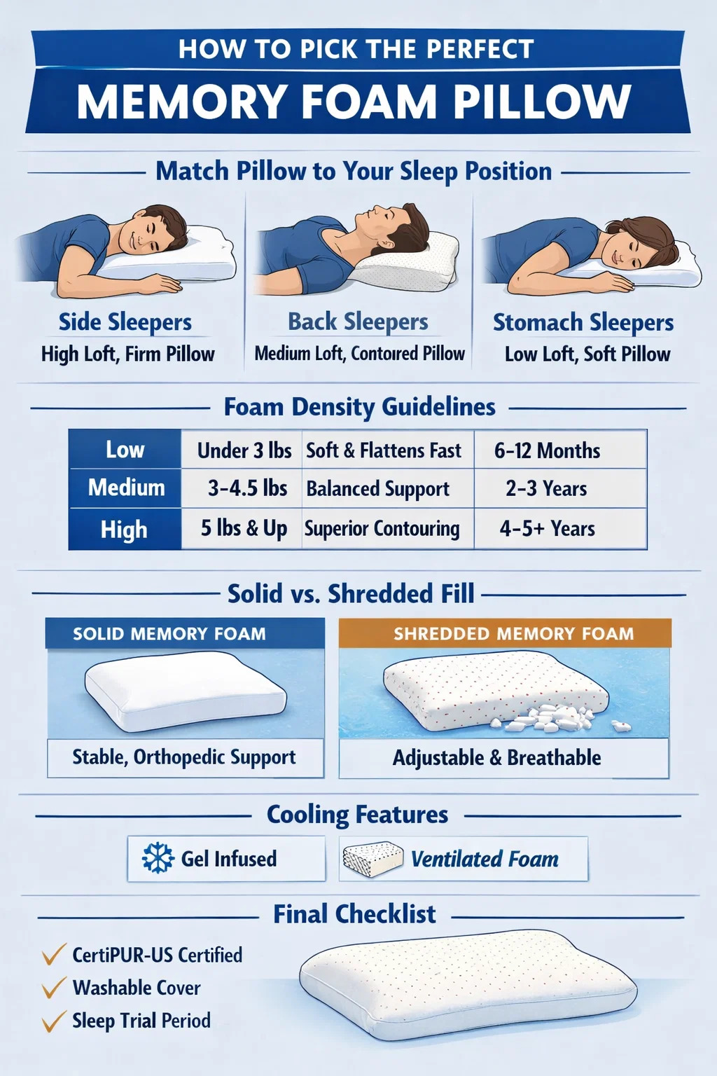 لاختيار الحق وسادة رغوة الذاكرة ، يجب عليك مطابقة "ارتفاع" الوسادة و"ثباتها" مع وضع نومك الأساسي. يجب أن يختار الأشخاص الذين ينامون على الجانب وسادة ثابتة وعالية الجودة لملء فجوة الكتف. يحتاج الأشخاص الذين ينامون على الظهر إلى وسادة متوسطة الحجم ذات محيط للرقبة؛ ويحتاج الأشخاص الذين ينامون على المعدة إلى رغوة ناعمة ورقيقة جدًا أو حشوة ممزقة. خارج الموضع، تحقق دائمًا من كثافة الرغوة (استهدف 3.5 رطل/قدم مكعب أو أعلى) لضمان المتانة والدعم على المدى الطويل.