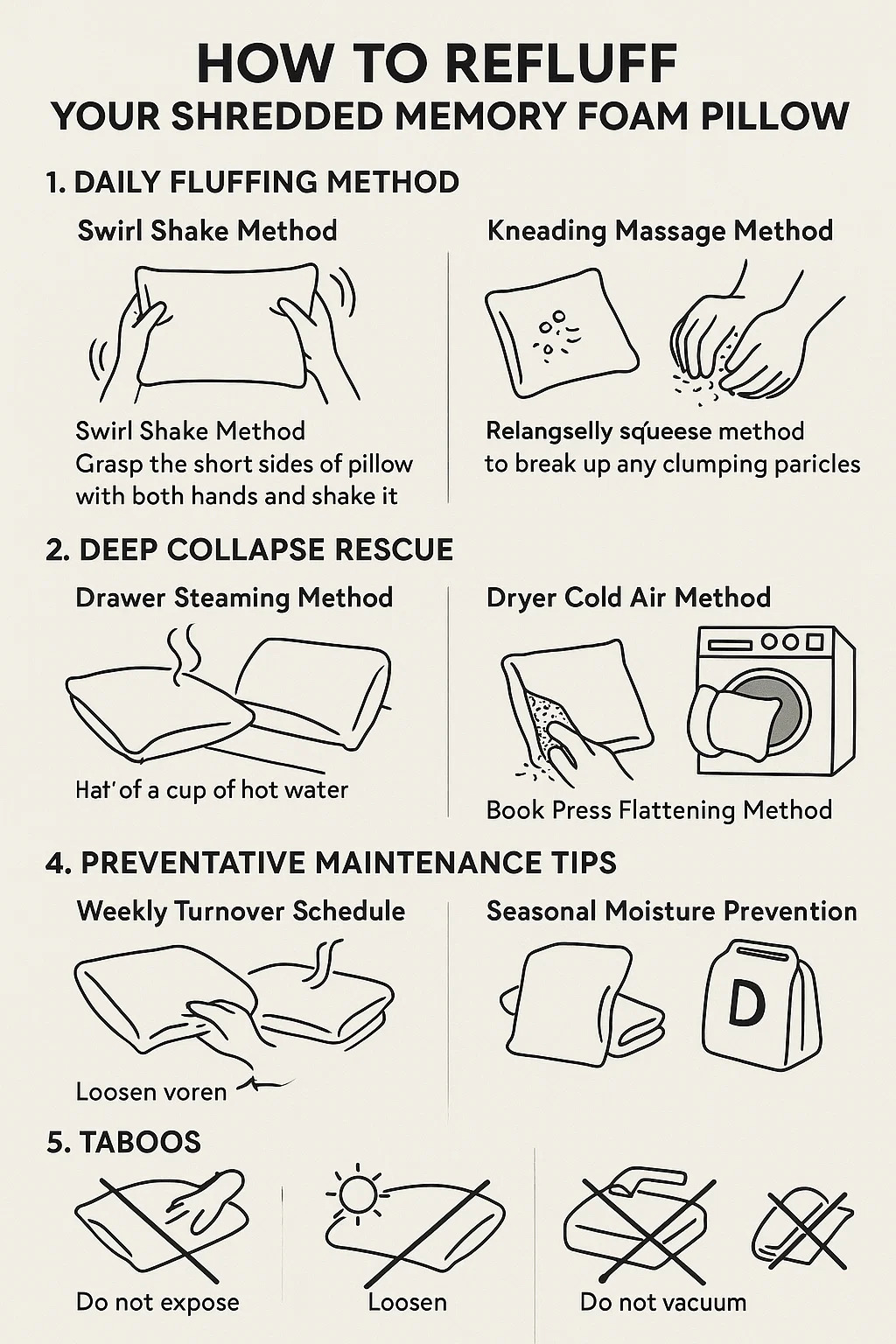 طريقة دوامة هز: فهم الجوانب القصيرة للوسادة بكلتا يديه واهزأها لأعلى ولأسفل بسرعة ثلاث مرات مثل البطانية لتوزيع الجزيئات.
