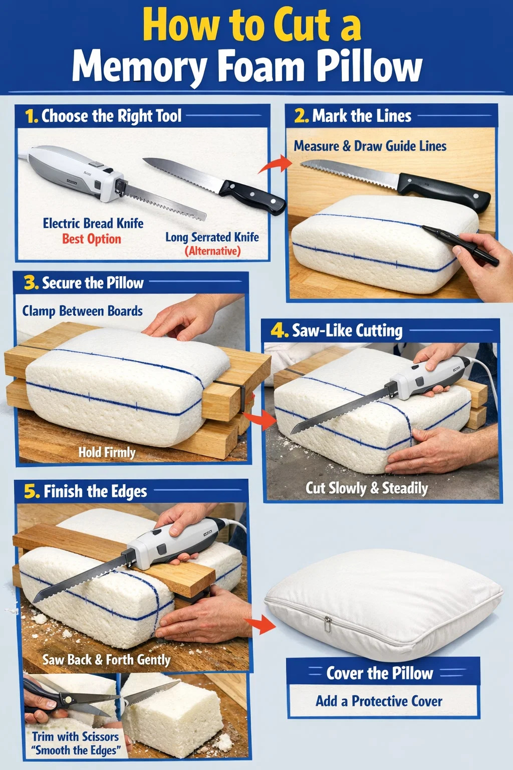 في بعض الأحيان، إذا كان أ وسادة رغوة الذاكرة مرتفع جدًا، أو تريد تحويله إلى مسند ظهر أو وسادة سفر، فقد تحتاج إلى استخدام أدوات القطع. نظرًا لأن الإسفنج الذكي مادة قوية وكثيفة للغاية، فإن قطعها بشكل عشوائي يمكن أن يترك الحواف غير متساوية ووعرة بسهولة.