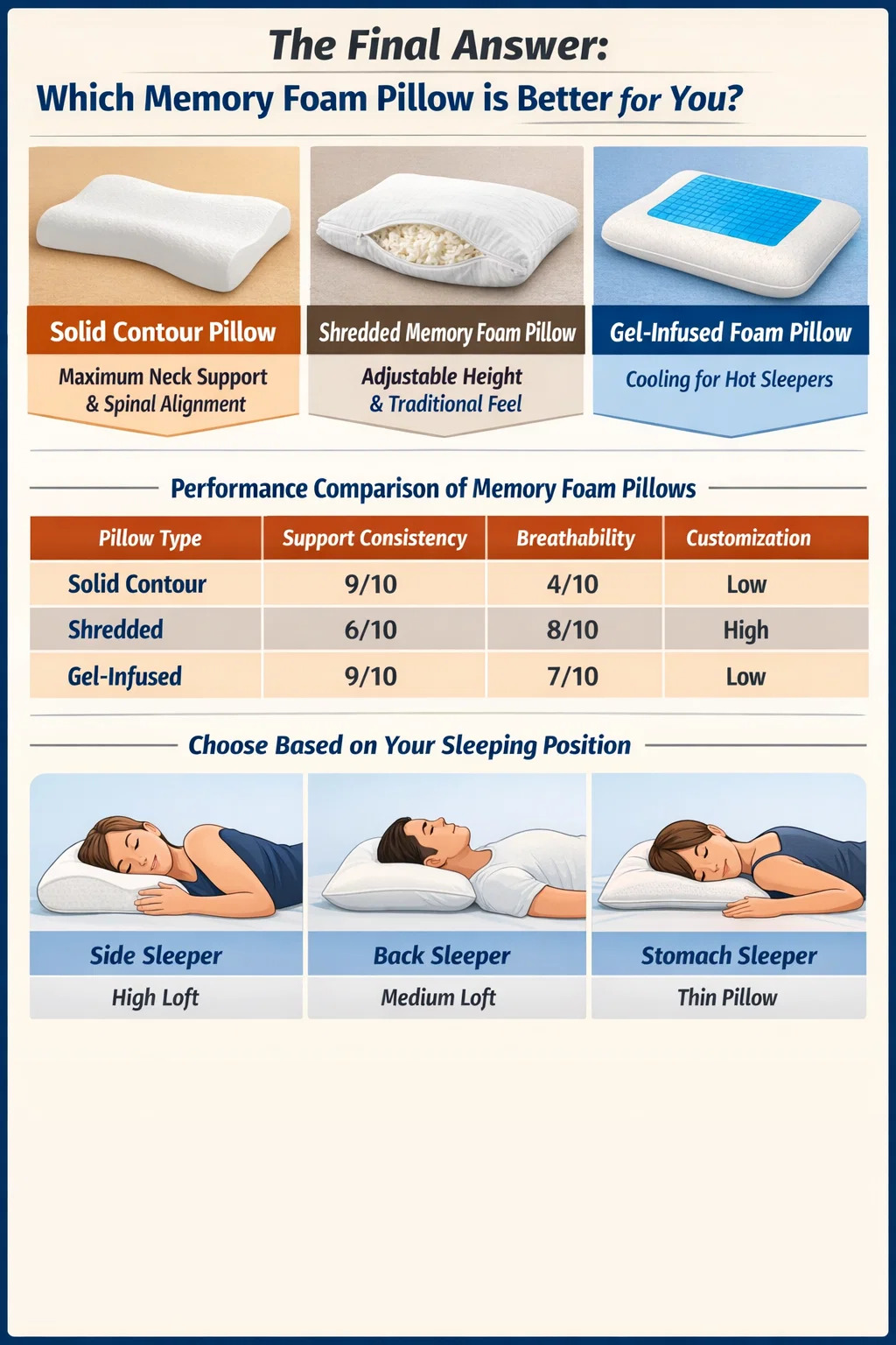 لا توجد وسادة واحدة "أفضل"، ولكن هناك وسادة فائزة بشكل واضح بناءً على عادات نومك المحددة. إذا كنت تعطي الأولوية لأقصى دعم للرقبة ومحاذاة العمود الفقري، أ وسادة إسفنجية ميموري فوم صلبة متفوق. إذا كنت تفضل الشعور التقليدي مع القدرة على ضبط الارتفاع، أ وسادة رغوة الذاكرة تمزيقه هو الخيار الأفضل. بالنسبة لأولئك الذين يستيقظون بشكل متكرر وهم يتعرّقون، أ وسادة رغوة الذاكرة مملوءة بالهلام أو ذات خلية مفتوحة هو الخيار الوحيد القابل للتطبيق لمنع ارتفاع درجة الحرارة.